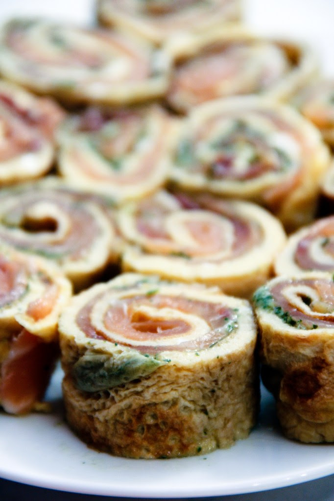 • On top of a base of transparent film, place our omelete-pesto-salmon dish and roll it smoothly making some pressure.